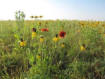Black-Eyed Susan, Butterfly Milkweed, Dwarf Evening Primrose, Golden Alexander, Hoary Vervain, Indian Blanket, Lavender Hyssop, Lance-Leaved Coreopsis, Narrow-Leaf Purple Coneflower, Nodding Pink Onion, Ohio Spiderwort, Plains Coreopsis, Prairie Coneflower, Purple Prairie Clover, Rough Blazingstar and Shell-Leaf Penstemon.